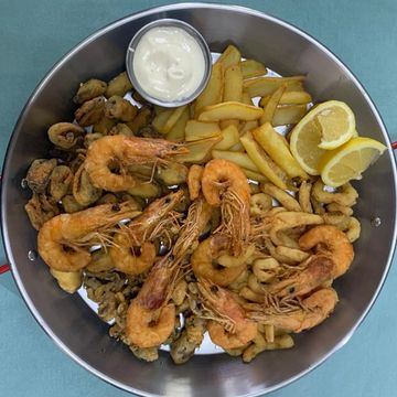 caracatiță, midii, creveți, inele de calamar, cartofi, maioneză